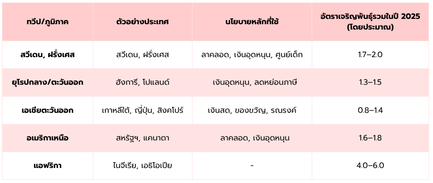 จากข้อมูลในตาราง จะเห็นได้ว่า นโยบายที่ช่วยให้ผู้หญิงสามารถทำงานและเลี้ยงลูกได้พร้อมกัน (work-family balance) เช่น การลาคลอด/การลาของพ่อแม่ที่ได้รับค่าตอบแทน การสนับสนุนค่าเลี้ยงดูเด็ก และบริการดูแลเด็กที่เข้าถึงได้ง่ายมีแนวโน้มช่วยให้อัตราเจริญพันธุ์รวมสูงขึ้นในยุโรปเหนือ/ตะวันตก เช่น สวีเดน และ ฝรั่งเศส3-7 ขณะที่ในเอเชียตะวันออก เช่น สิงคโปร์ ญี่ปุ่น และเกาหลีใต้ที่ผ่านมา แม้มีนโยบายหลายอย่าง แต่อัตราเจริญพันธุ์รวมยังต่ำมาก ส่วนหนึ่งอาจเป็นผลมาจากปัจจัยทางสังคม เศรษฐกิจและวัฒนธรรม6, 8-11 ที่เป็นข้อจำกัดในการเลี้ยงดูลูก เช่น ภาวะเศรษฐกิจไม่มั่นคงทำให้ครอบครัวกังวลกับค่าใช้จ่ายในการเลี้ยงดูลูกที่เพิ่มขึ้น การเสียโอกาสการทำงานของผู้หญิงที่ต้องหยุดงานเพื่อดูแลลูก และวิถีชีวิตที่ต้องการเวลาและอิสระในการทำงานหรือทำกิจกรรมที่ชอบ ซึ่งหากมีลูกจะไม่สามารถทำได้อีก ส่วนในประเทศรายได้ต่ำ เช่น ไนจีเรีย และ เอธิโอเปีย อัตราเจริญพันธุ์รวมยังสูง จึงยังไม่มีนโยบายส่งเสริมการเกิด12, 13