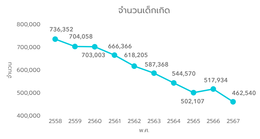 ปัจจัยหลักสำคัญที่ส่งผลกระทบต่อโครงสร้างทางประชากร คือ จำนวนการเกิดที่ลดลงอย่างต่อเนื่องและในปี 2567 เป็นปีแรกที่จำนวนเด็กเกิดต่ำกว่า 500,000 คน (แผนภูมิ 1) สะท้อนถึงประชากรวัยแรงงานจะลดลงตามไปด้วย และการลดลงของประชากรวัยทำงาน ผลที่ตามมาคือ อัตราส่วนพึ่งพิงวัยสูงอายุเพิ่มขึ้นต่อเนื่อง ซึ่งสะท้อนถึงความยากลำบากในการรักษาความมั่นคงทางเศรษฐกิจและสวัสดิการสังคม