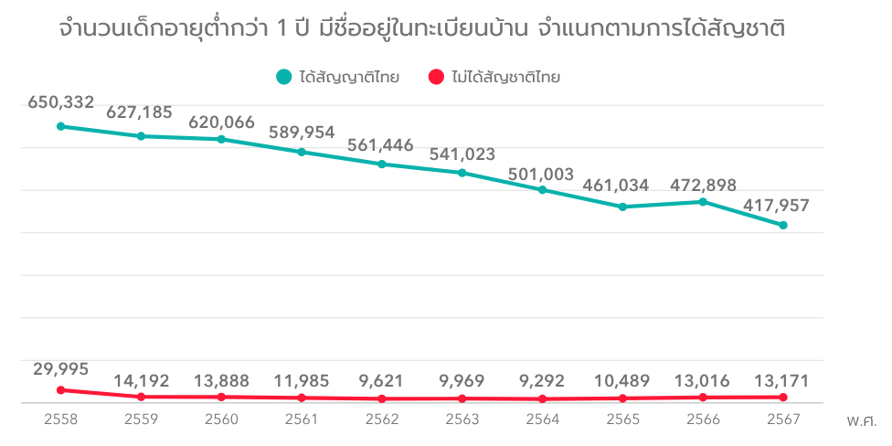 หนึ่งในปัจจัยที่อาจจะช่วยบรรเทาผลกระทบจากสังคมสูงวัยของไทย คือ กลุ่มเด็กที่เกิดในประเทศไทยแต่ไม่ได้รับสัญชาติไทย ซึ่งเด็กกลุ่มนี้ส่วนใหญ่เป็นบุตรของแรงงานข้ามชาติจากประเทศเพื่อนบ้าน ได้แก่ เมียนมา ลาว และกัมพูชา ข้อมูลจากกรมการปกครอง กระทรวงมหาดไทย3 ระหว่างปี พ.ศ. 2558–2567 ระบุว่า มีจำนวนเด็กอายุต่ำกว่า 1 ปี ที่เกิดในประเทศไทยมีชื่ออยู่ในทะเบียนบ้านแต่ไม่ได้รับสัญชาติไทย ประมาณกว่า 10,000 คนต่อปี (แผนภูมิ 2) การบูรณาการเด็กกลุ่มนี้เข้าสู่ระบบการศึกษา สวัสดิการสังคม และการพิจารณาให้สิทธิในการได้สัญชาติไทย อาจมีส่วนช่วยเพิ่มกำลังแรงงานในอนาคต และปรับปรุงอัตราส่วนประชากรวัยทำงานต่อผู้สูงอายุ (potential support ratio) ได้ในระดับหนึ่ง ถึงแม้ว่าจะไม่เพียงพอที่จะทดแทนการสูงวัยของประชากรโดยรวม แต่กลุ่มเด็กเหล่านี้ถือเป็น “ทุนมนุษย์” ที่สำคัญต่อการวางแผนนโยบายประชากรระยะยาว