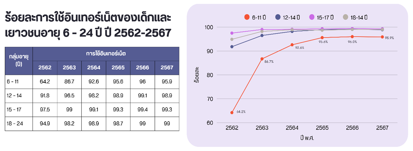 จากรายงานผลการสำรวจพฤติกรรมผู้ใช้อินเทอร์เน็ตในประเทศไทย ปี 25652 ระบุว่า คนไทย (ตั้งแต่อายุน้อยกว่า 22 ปี-77 ปีขึ้นไป) ใช้อินเทอร์เน็ตเฉลี่ย 7 ชั่วโมง 4 นาทีต่อวัน ซึ่งในกลุ่ม Gen Z (อายุน้อยกว่า 22 ปี) มีสัดส่วนการใช้งานเฉลี่ยสูงถึง 8 ชั่วโมง 24 นาทีต่อวัน และกว่าร้อยละ 80 ใช้สื่อสังคมออนไลน์ (social media) เป็นกิจกรรมหลักในชีวิตประจำวัน โดยใช้เพื่อติดต่อสื่อสาร เล่นเกม ดูวิดีโอ และติดตามข่าวสารบนแพลตฟอร์มต่าง ๆ ขณะที่การสำรวจของสำนักงานสถิติแห่งชาติ ในปี 25673 รายงานว่า เด็กและเยาวชนไทยอายุ 6-24 ปี มีโทรศัพท์มือถือเป็นของตัวเองถึง ร้อยละ 81.5 และมีการใช้อินเทอร์เน็ตเพิ่มขึ้นอย่างต่อเนื่อง จากร้อยละ 86.3 ในปี 2562 เป็นร้อยละ 98.2 ในปี 2567 โดยเมื่อพิจารณาในแต่ละกลุ่มอายุ พบว่า มีแนวโน้มการใช้อินเทอร์เน็ตเพิ่มขึ้นในทุกกลุ่มอายุโดยเฉพาะกลุ่มอายุ 6-11 ปี มีอัตราการเพิ่มขึ้นของการใช้อินเทอร์เน็ตสูงที่สุด เมื่อเทียบกับกลุ่มอายุอื่น ๆ
