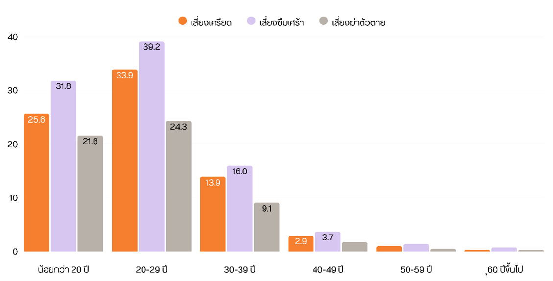เมื่อ “โลกจอ” กลายเป็นส่วนหนึ่งของชีวิตประจำวัน ผลพวงที่ตามมาคือ “ภาวะใจ” ที่เปราะบางมากขึ้น เด็กจำนวนไม่น้อยเริ่มแสดงอาการเครียด วิตกกังวล สมาธิสั้น และความรู้สึกโดดเดี่ยว จากการใช้สื่อเกินพอดี ซึ่งไม่ได้กระทบเพียงสุขภาพกาย แต่ยังสั่นคลอนถึง “สุขภาพใจ” ของเด็กและเยาวชนไทยอย่างมีนัยสำคัญ ข้อมูลการประเมินสุขภาพจิตของคนไทย ปี 2566 พบว่า กลุ่มอายุน้อยมีปัญหาสุขภาพจิตสูงกว่ากลุ่มอายุอื่นอย่างชัดเจน โดยเฉพาะในกลุ่มอายุ 20–29 ปี มีความเสี่ยงซึมเศร้าสูงสุดที่ 39.2% รองลงมาคือ เสี่ยงเครียด 33.9% และเสี่ยงฆ่าตัวตาย 24.3% ส่วนกลุ่มอายุน้อยกว่า 20 ปี มีสัดส่วนความเสี่ยงในระดับใกล้เคียงกัน (เครียด 25.6% ซึมเศร้า 31.8% และเสี่ยงฆ่าตัวตาย 21.6%) สะท้อนให้เห็นว่า เยาวชนเป็นกลุ่มที่เผชิญความเครียด ภาวะซึมเศร้า และความเสี่ยงต่อการฆ่าตัวตายสูงที่สุดเมื่อเทียบกับกลุ่มอื่น ๆ