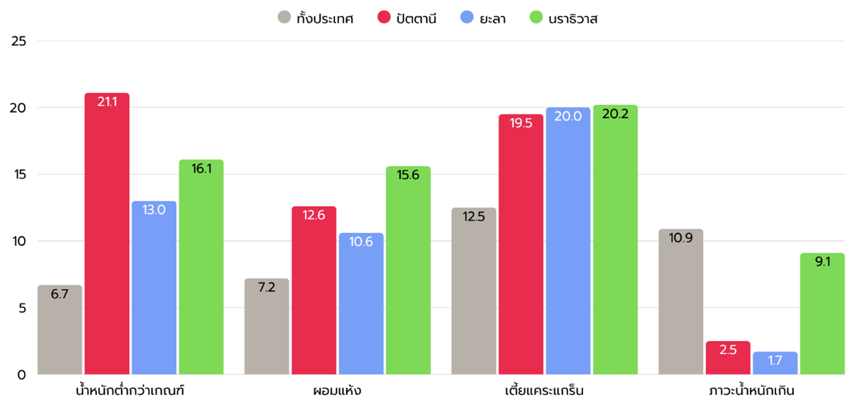 ประโยคนี้อาจสะท้อนความจริงอันขมขื่นของพื้นที่ที่เต็มไปด้วยความเปราะบางทางเศรษฐกิจและสังคม ภาวะทุพโภชนาการในเด็กอายุต่ำกว่า 5 ปี ยังคงเป็นปัญหาเรื้อรังในสามจังหวัดชายแดนใต้ จากการสำรวจสถานการณ์เด็กและสตรีในประเทศไทย ปี 25651 สะท้อนให้เห็นว่า “พื้นที่ชายแดนใต้ยังคงเผชิญความเหลื่อมล้ำทางโภชนาการอย่างต่อเนื่อง” เด็กอายุต่ำกว่า 5 ปีในสามจังหวัดชายแดนใต้มีภาวะทุพโภชนาการสูงกว่าค่าเฉลี่ยของประเทศ 2–3 เท่า โดยเฉพาะจังหวัดปัตตานี ซึ่งมีเด็กน้ำหนักต่ำกว่าเกณฑ์ถึง ร้อยละ 21.1 และภาวะผอมแห้ง ร้อยละ 12.6 ขณะที่ในทั้งสามจังหวัด มีอัตราภาวะแคระแกร็นในระดับใกล้เคียงกัน ร้อยละ 19.5-20.2 ตัวเลขเหล่านี้สะท้อน “ภาวะขาดสารอาหารเรื้อรัง” ที่ยังฝังลึกในพื้นที่ ทั้งจากข้อจำกัดด้านเศรษฐกิจ พฤติกรรมการบริโภค และการเข้าถึงบริการสุขภาพที่ไม่เท่าเทียม แม้ประเทศไทยจะมียุทธศาสตร์โภชนาการระดับชาติที่ชัดเจน แต่ข้อมูลจากชายแดนใต้กลับชี้ว่าช่องว่างเชิงนโยบายยังคงมีอยู่จริง และต้องได้รับการแก้ไขอย่างเป็นระบบมากกว่าการให้ความช่วยเหลือในระยะสั้น