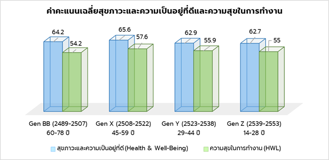 แผนภูมิ 1: ค่าคะแนนเฉลี่ยสุขภาวะและความเป็นอยู่ที่ดี และความสุขในการทำงาน จำแนกตามเจนเนอเรชัน