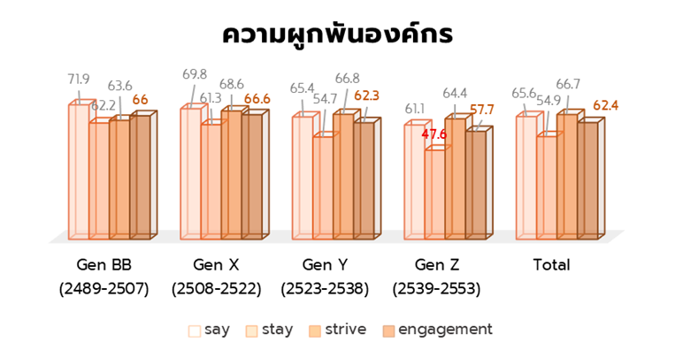 ผลสำรวจเผยอีกว่า ค่าคะแนนเฉลี่ยความผูกพันต่อองค์กร (Engagement) ที่ประกอบด้วย ความรักองค์กร (Say) ความภักดีต่อองค์กร (Stay) และความทุ่มเทให้กับองค์กร (Strive) ของคนทำงานในภาพรวม อยู่ที่ 62.4 แต่มีเพียง 21.5% ที่มีความผูกพันต่อองค์กรอยู่ในระดับสูง