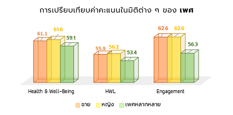 แม้ประเทศไทยจะมีชื่อเสียงในด้านการยอมรับความหลากหลายทางเพศ แต่ตัวเลขจากการสำรวจกลับสะท้อนให้เห็นถึงความเหลื่อมล้ำเมื่อเปรียบเทียบกลุ่มเพศทางเลือกกับคนทำงานเพศชายและหญิง โดยพบว่า กลุ่มเพศทางเลือกมีระดับสุขภาวะและความเป็นอยู่ที่ดี ความสุขในการทำงาน (Happy Work-Life) และความผูกพันองค์กรต่ำกว่าคนทำงานเพศหญิงและเพศชาย กล่าวคือ ค่าคะแนนสุขภาวะและความเป็นอยู่ที่ดีของเพศหลากหลายอยู่ที่ 59.1 ขณะที่เพศหญิงอยู่ที่ 61.6 และเพศชาย 61.1 ด้านค่าคะแนนความสุขในการทำงานของเพศหลากหลายอยู่ที่ 53.4 ขณะที่เพศหญิง อยู่ที่ 56.2 และเพศชาย อยู่ที่ 55.9 ด้านค่าคะแนนความผูกพันองค์กรของเพศหลากหลายอยู่ที่ 56.3 ขณะที่เพศหญิง และ เพศชายมีค่าคะแนนเท่ากัน คือ 62.6 (แผนภูมิ 3)