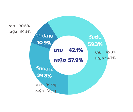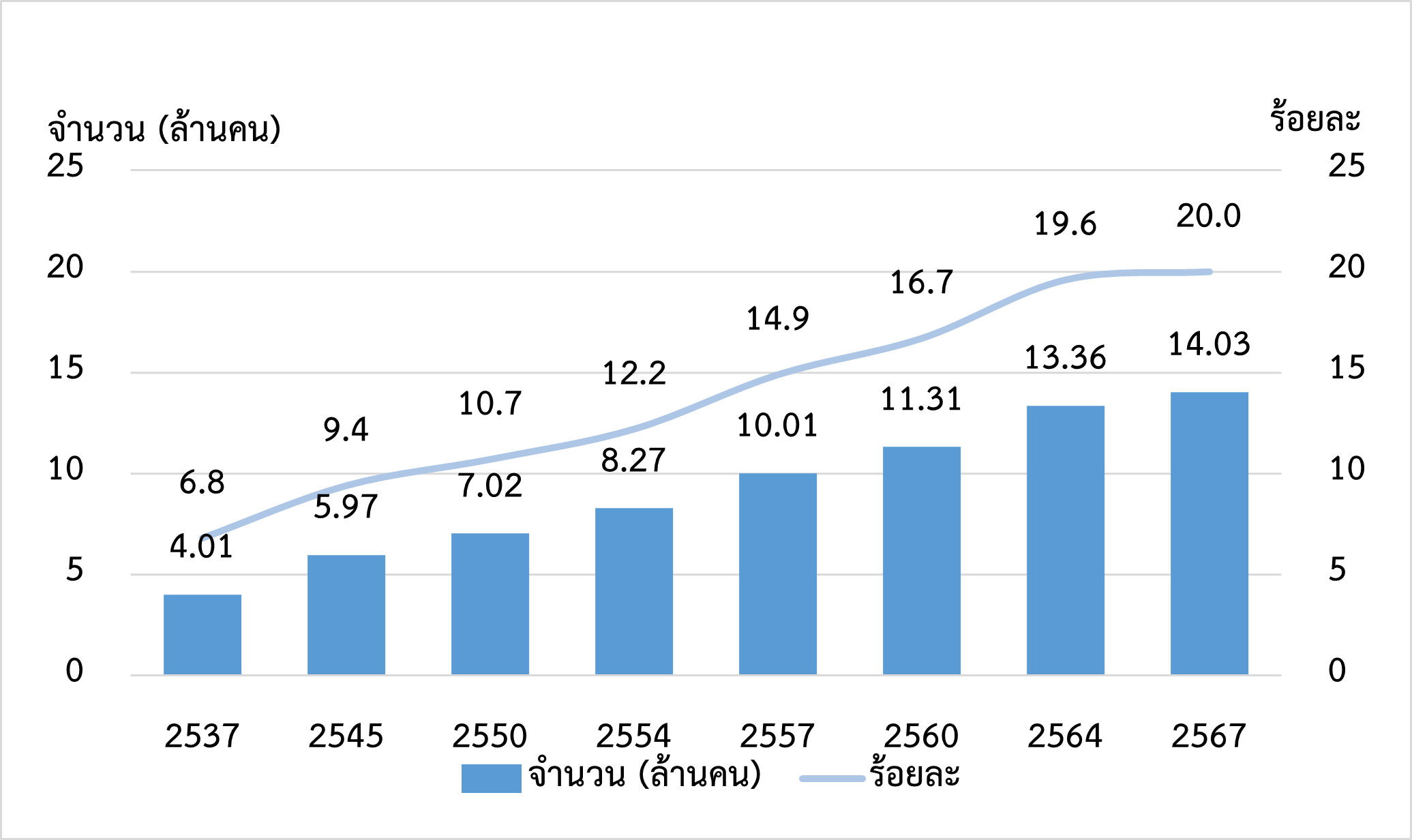ข้อมูลจากรายงานการสำรวจประชากรสูงอายุในประเทศไทย พ.ศ. 25671 ชี้ให้เห็นว่า จำนวนประชากรที่มีอายุ 60 ปีขึ้นไป มีแนวโน้มเพิ่มสูงขึ้นอย่างต่อเนื่องในช่วง 30 ปีที่ผ่านมา จากร้อยละ 6.8 ในปี 2537 เป็น ร้อยละ 20 ในปี 2567 ทั้งนี้กว่าร้อยละ 59 เป็นผู้สูงอายุวัยต้น (60-69 ปี) ความแตกต่างระหว่างเพศ จะเห็นได้ชัดในกลุ่มผู้สูงอายุวัยกลาง และผู้สูงอายุวัยปลาย ที่เป็นเพศหญิงมากกว่าร้อยละ 60