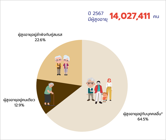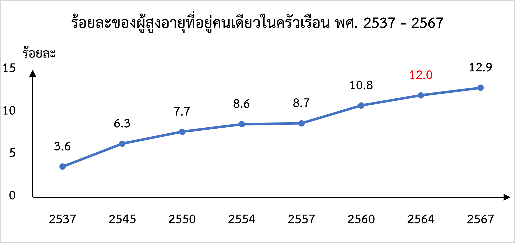 การสำรวจประชากรสูงอายุในประเทศไทย พ.ศ. 2567 ยังชี้ให้เห็นอีกว่า รูปแบบ การอยู่อาศัยของผู้สูงอายุในประเทศไทยนั้น มีการเปลี่ยนแปลงที่สำคัญในรูปแบบการอยู่อาศัย โดยเฉพาะสัดส่วนของผู้สูงอายุที่อาศัยอยู่คนเดียว มีแนวโน้มเพิ่มขึ้นอย่างต่อเนื่อง จากร้อยละ 3.6 ในปี 2537 เป็นร้อยละ 12.9 (ประมาณ 1.8 ล้านคน) ในปี 2567 รวมทั้งข้อมูลในปี 2567 ยังพบสัดส่วนผู้สูงอายุที่อยู่ลำพังกับคู่สมรสมีถึงร้อยละ 22.6 ซึ่งเป็นไปได้อย่างสูงว่ากลุ่มนี้ส่วนใหญ่เป็นผู้สูงอายุเช่นเดียวกัน