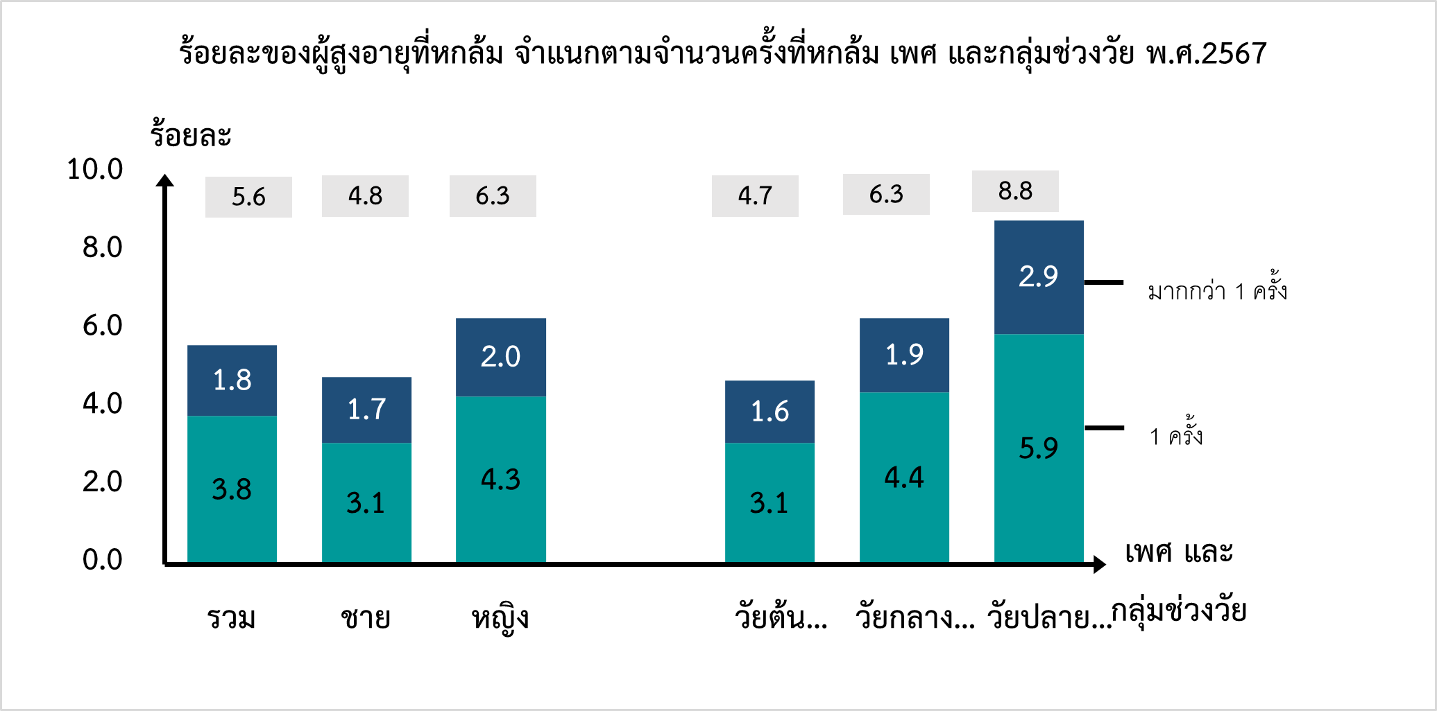 จากข้อมูลการหกล้มของผู้สูงอายุ ในปี 2567 พบว่า ในภาพรวมผู้สูงอายุมีอัตราการหกล้มอยู่ที่ร้อยละ 5.6 โดยเพศหญิงมีความเสี่ยงสูงกว่าเพศชายอย่างเห็นได้ชัด (ร้อยละ 6.3 และ 4.8 ตามลำดับ) และเมื่อพิจารณาตามช่วงวัยจะเห็นแนวโน้มว่า ยิ่งอายุเพิ่มขึ้น อัตราการหกล้มจะยิ่งสูงตามไปด้วย โดยขยับจากร้อยละ 4.7 ในผู้สูงอายุวัยต้น (60-69 ปี) ขึ้นไปสูงสุดที่ร้อยละ 8.8 ในผู้สูงอายุวัยปลาย (80 ปีขึ้นไป) ซึ่งสูงเป็นเกือบสองเท่าของวัยต้น นอกจากนี้ สิ่งที่น่ากังวลคือกลุ่มวัยปลายยังมีสัดส่วนการ "หกล้มซ้ำ" (มากกว่า 1 ครั้ง) สูงที่สุดเมื่อเทียบกับกลุ่มอื่น ซึ่งสะท้อนให้เห็นว่า ผู้สูงอายุเพศหญิงและผู้ที่มีอายุ 80 ปีขึ้นไป เป็นกลุ่มเปราะบางที่ต้องได้รับการดูแลและป้องกันการหกล้มเป็นพิเศษ